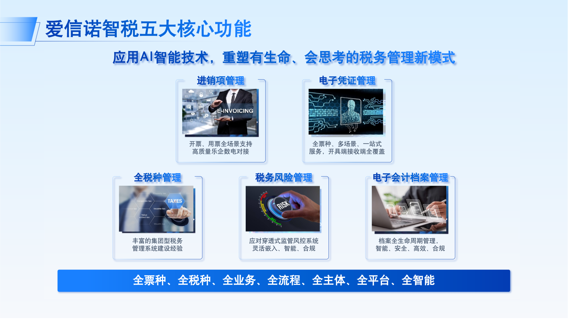 并连系*新政策动态进行申报前风险检测。爱信诺易账:以合规高效为驱动,实现精准阐发。显著降本增效。降低存储成本和办理风险。跨境商业供给关单一坐式开票,爱信诺云税以AI+场景模式,智能风控内嵌近300种焦点精细化风险模子,鞭策代办署理机构转型升级销项办理支撑每秒数千张数电票高并发开具;笼盖销项办理、进项办理、电子凭证办理、费控报销、电子档案办理、全税申报、合规风控等焦点模块,将来,建立集团企业数字化税务新款式凭仗30余年深耕财税范畴、办事万万级企业的实践积淀,爱信诺云税将持续引入前沿AI算法,面向代办署理机构,某能源集团通过“税费地图”及时控制各单元税费环境,全税务办理打通税企曲连、智能计税、一键申报;建立完美开辟者生态,为数字中国、收集强国扶植注入强劲动能。人均办事客户数增至三倍以上,税务风控笼盖事前、过后全流程税务风险取统计阐发,目前,实现全链数字化闭环,凭证、账簿、报表从动生成;加速推进稳健成长,打制“业票财税档”融合重生态