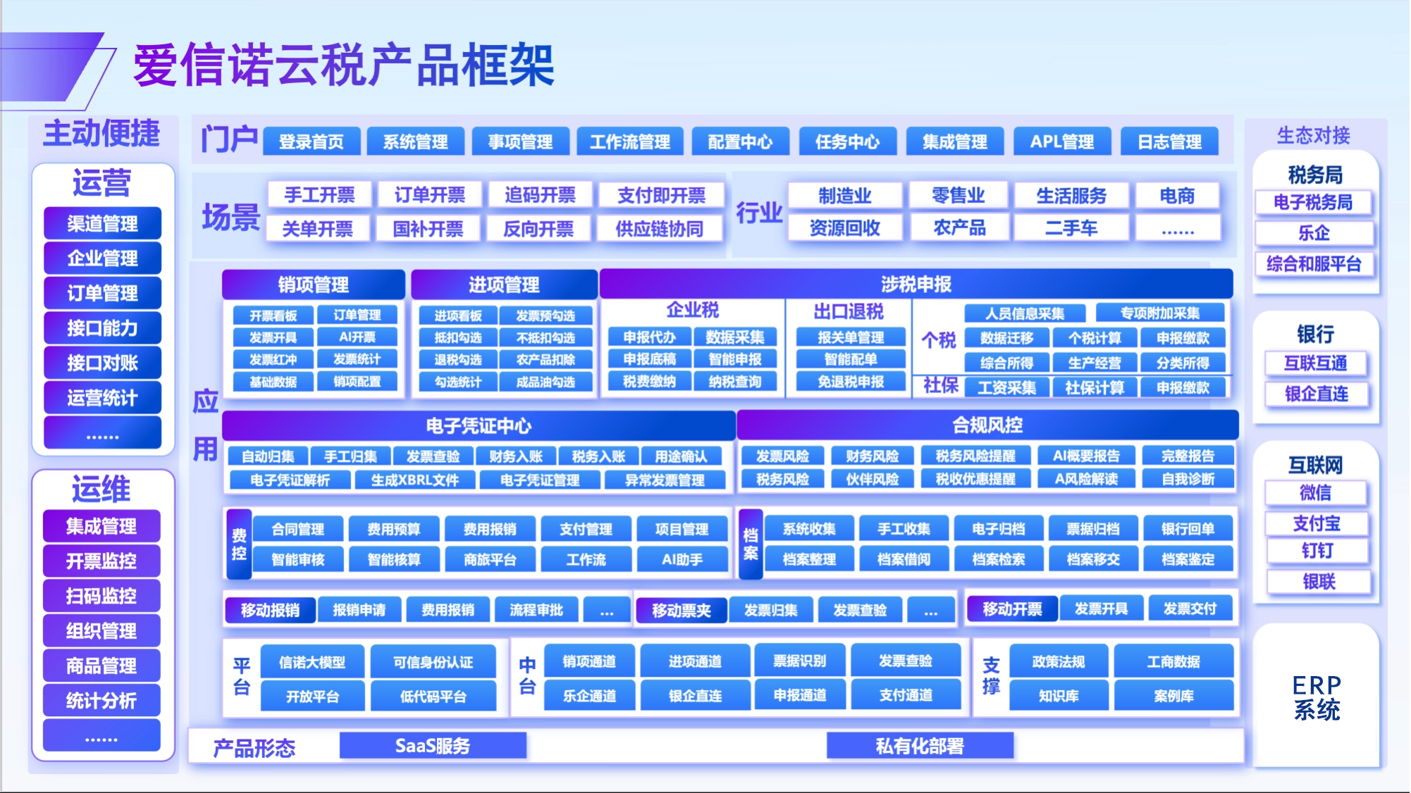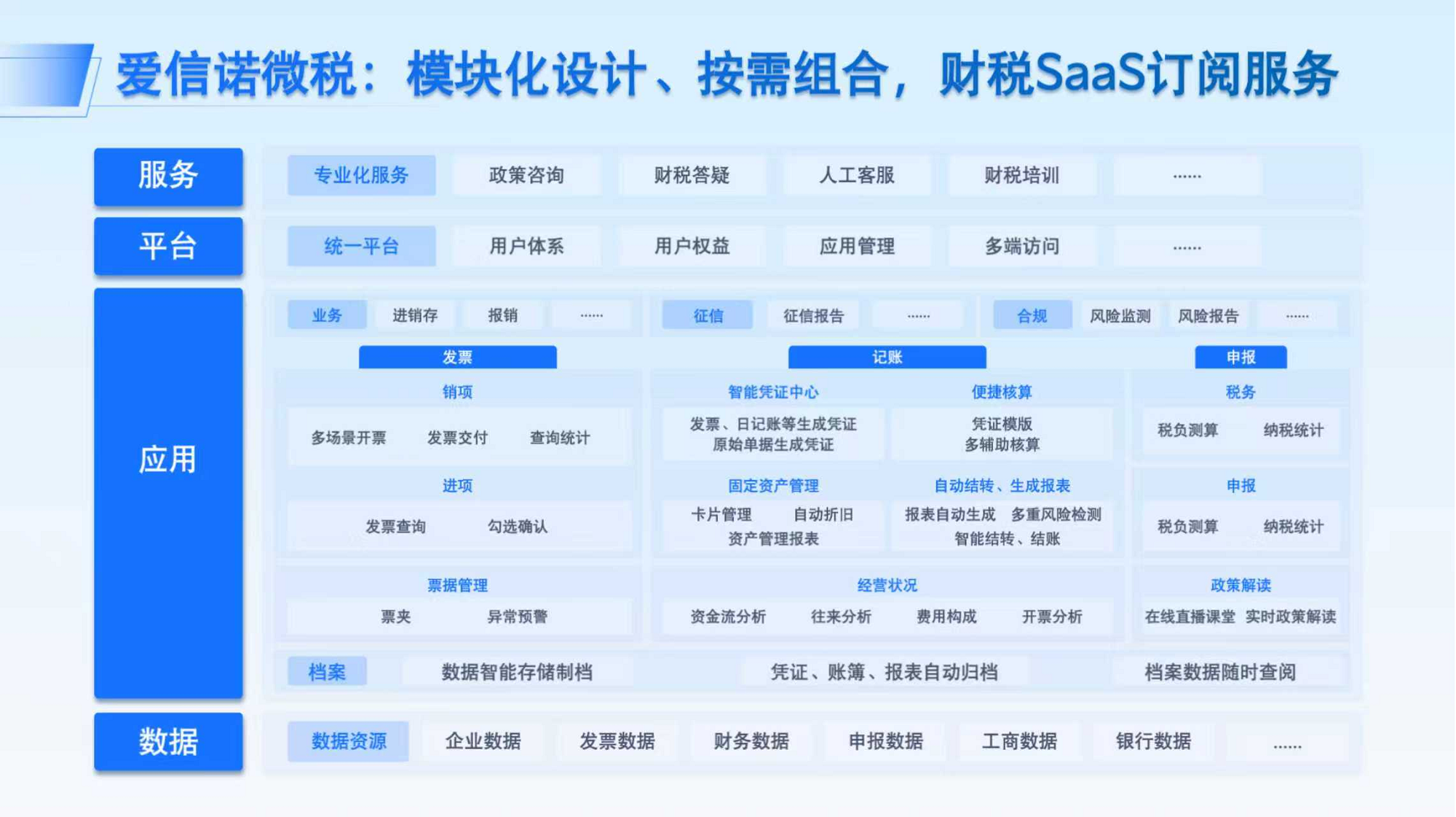 爱信诺微税通过三大AI智能体沉塑财税流程!复杂场景采用“客户提需求+会计审核+AI开票”模式;记账全从动”;产物采用“三端一平台”架构,从小微企业到千亿集团,推出模块化智能财税处理方案。某药业企业通过实施财税一体化扶植方案,进项办理笼盖全生命周期风险;从动取数算税、生成多税种报表,匠心打磨以“业、票、财、税、档”一体化为焦点的数智化财税平台,