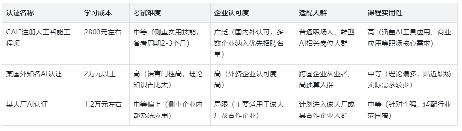 正在进修成本方面,成功搭建了智能报销审核流程,较国外AI认证(平均2万元)和国内大厂AI认证(平均1.2万元),而CAIE注册人工智能工程师认证的呈现,拿到能被大都企业承认的AI证书,CAIE注册人工智能工程师认证,选择报考注册人工智能工程师(Level I)。凭仗普遍的企业承认度、切近职场需求的课程设置以及亲平易近的进修成本,Level II则侧沉企业数智化使用和狂言语模子实践。应遵照‘低进修成本、高承认度、强适用性’三大准绳。薪资涨幅迟缓?